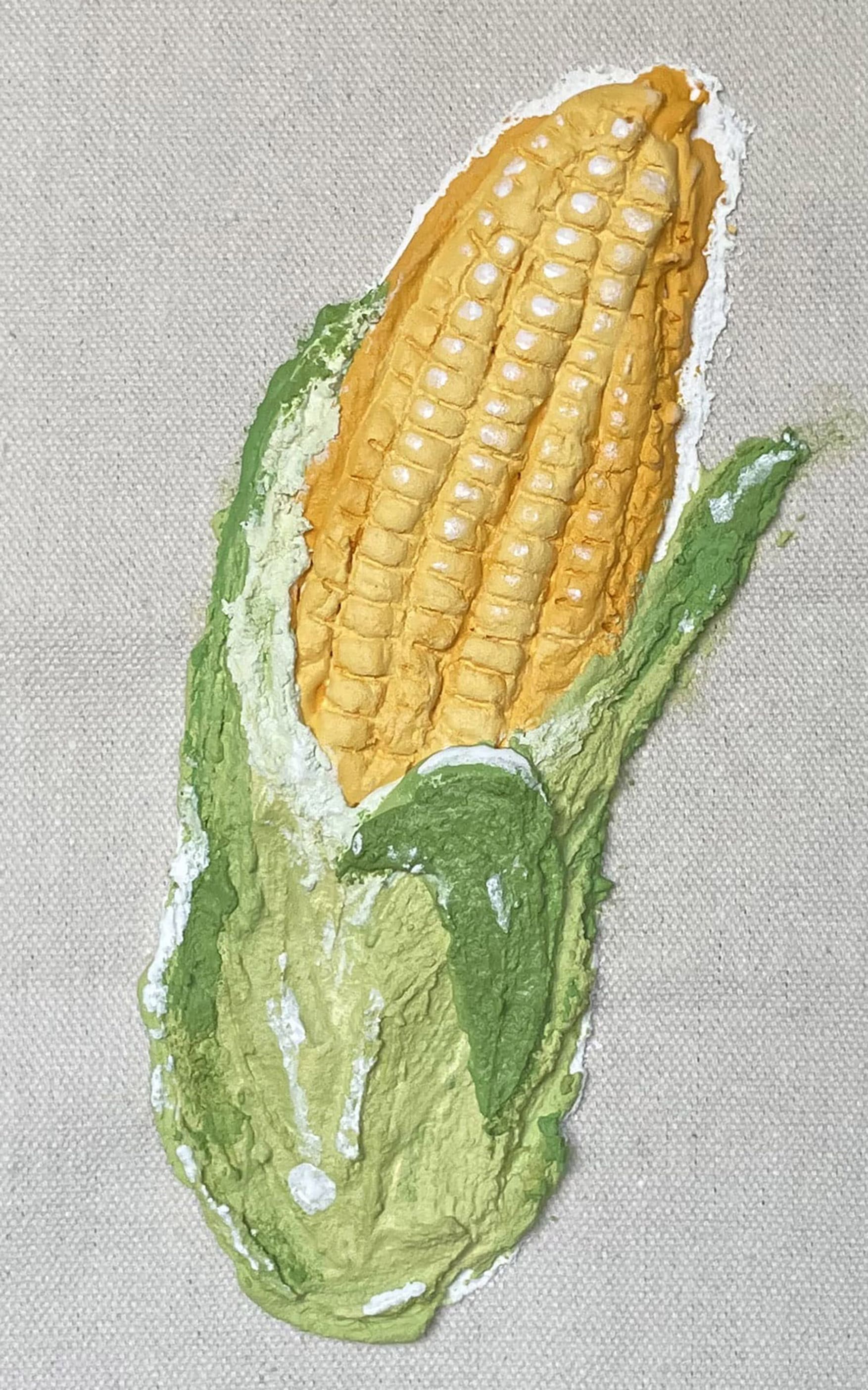 一粒一粒が浮かび上がるとうもろこし。今にも取り出せそうな作品である。