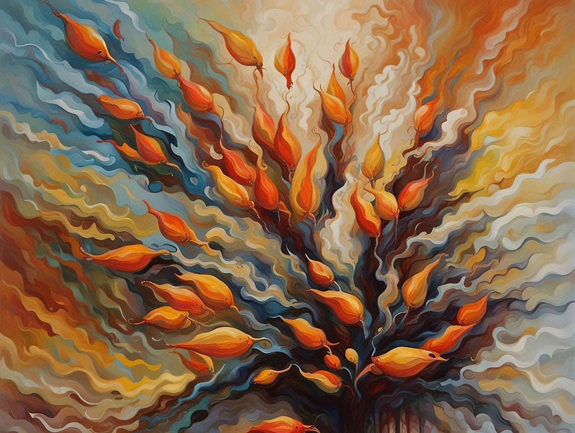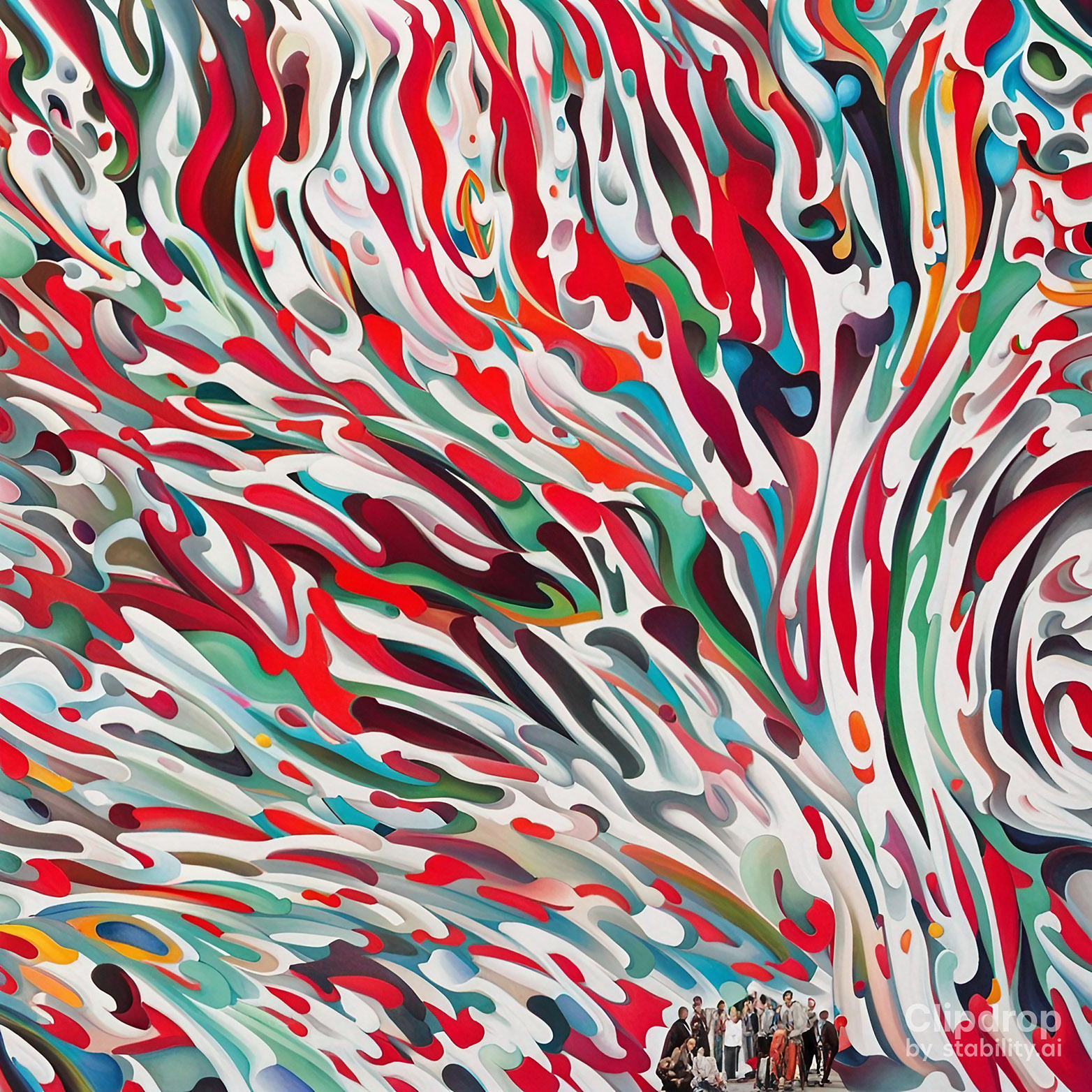 画の中の人々は色鮮やかなエビたちに守られているようにも、逃げ場のないように襲われているようにも見える。