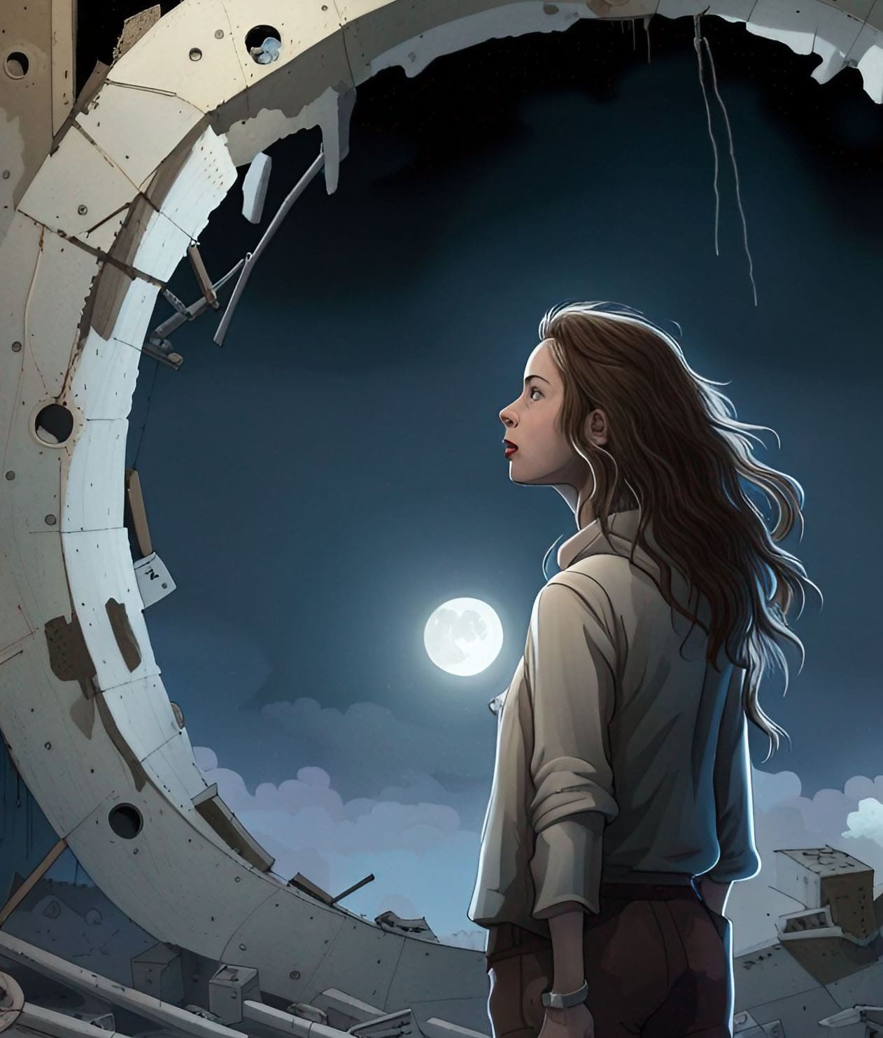 崩れかけた世界の背後には美しい月が見え、外に体を向けたまま崩れかけた世界を振り返る女性。